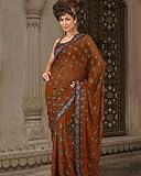 Highly impressive brown faux georgette saree with sequentially arranged beautiful bootis and finely embroidered border in sequins, resham and zari work comes with delicately embroidered blouse. True sophistication that will prove to be real breath taking. There might be slight color variation.